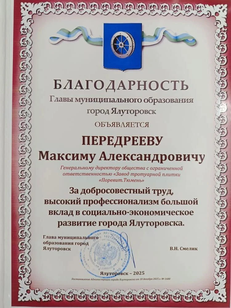 Также глава города Ялуторовска Вячеслав Смелик отметил благодарностью генерального директора завода тротуарной плитки «Поревит» в Ялуторовске Максима Передреева за добросовестный труд, высокий профессионализм и вклад в социально-экономическое развитие города Ялуторовска.