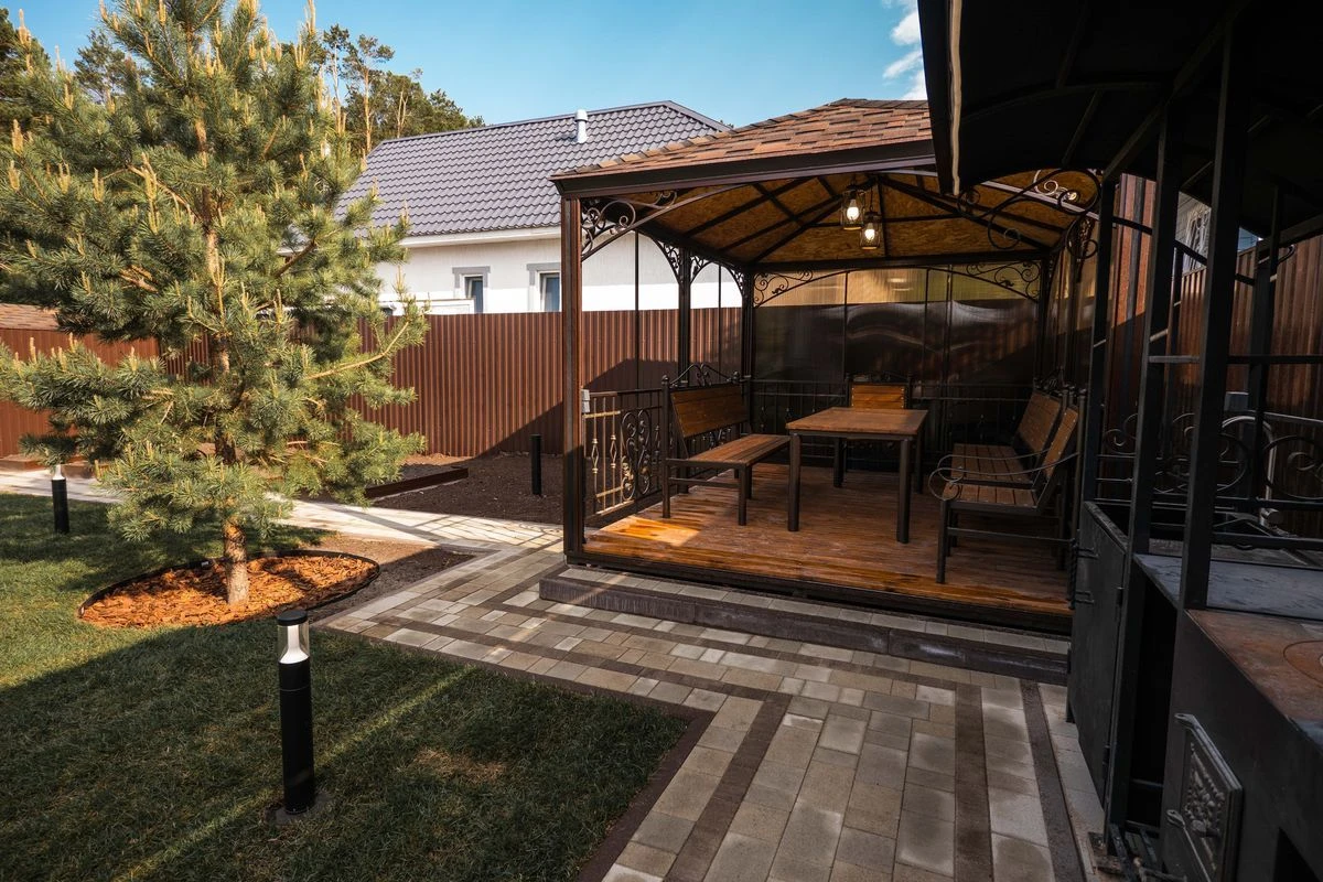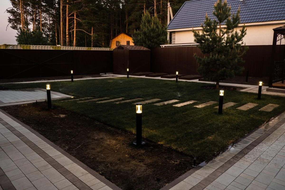 Освещение на участке также обязательно. Поэтому были установлены светильники в зоне рядом с дорожками. Кроме того, в мангальной зоне, где располагается беседка также были проведены коммуникации по водоснабжению и водоотведению.
