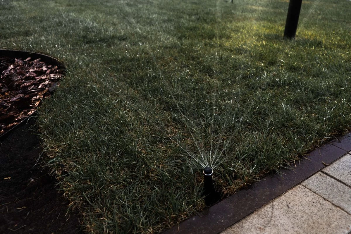 Также брусчаткой оформлена садово-огородная зона. Высокие грядки сделаны из металлического профиля. Чтобы газон выглядел привлекательно обязательно нужен автополив. Особенно в условиях засушливого лета.
