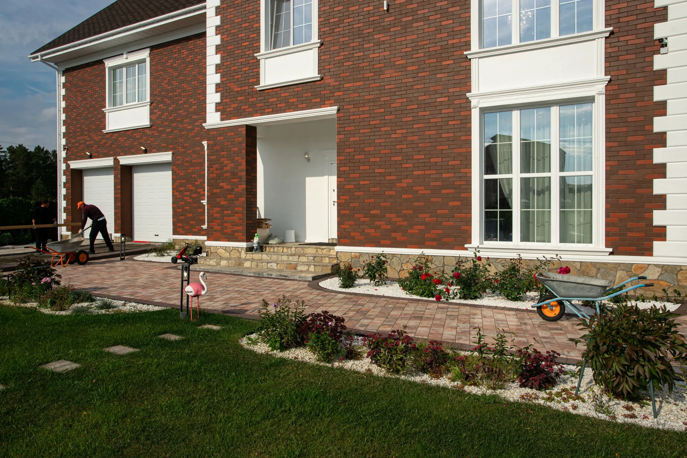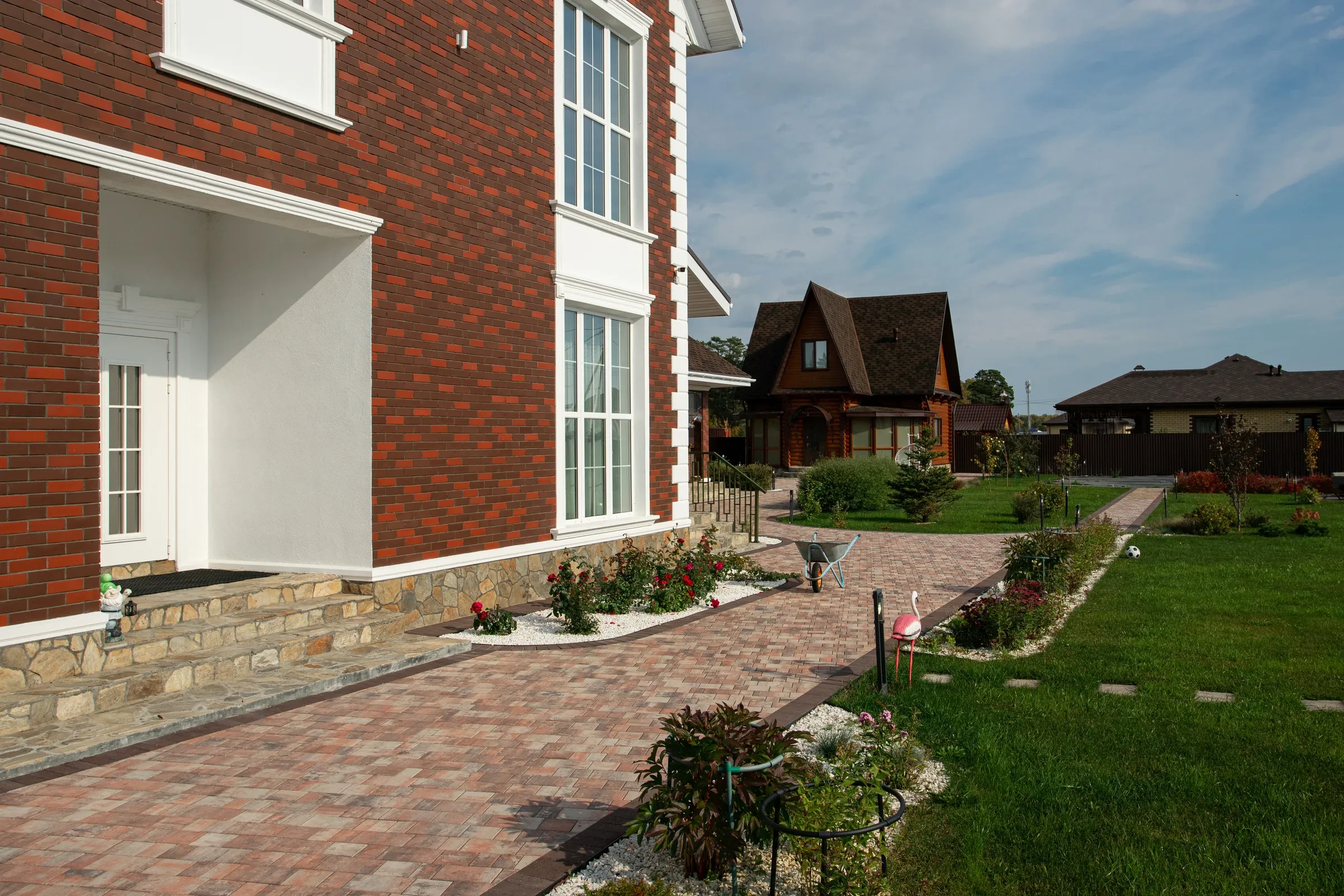 —Благоустройство участка под ключ с тротуарными дорожками цвета Клен