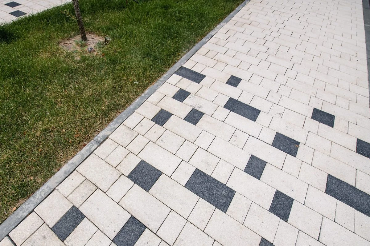Основной рисунок выстроен с помощью хаотичной разбивки черного и белого цвета, но в местах ближе к дороге или дому плитка переходит в один цвет — черный или белый. Это визуально отделяет прогулочную зону от всех остальных, при этом подобранные цвета гармонируют с постройкой.