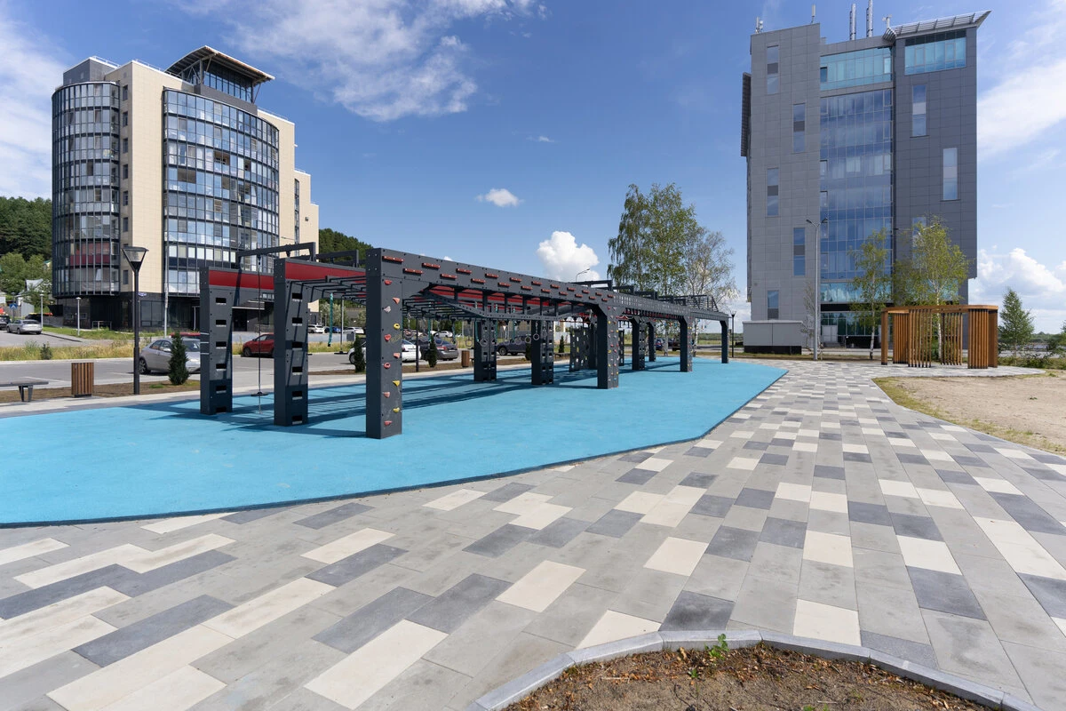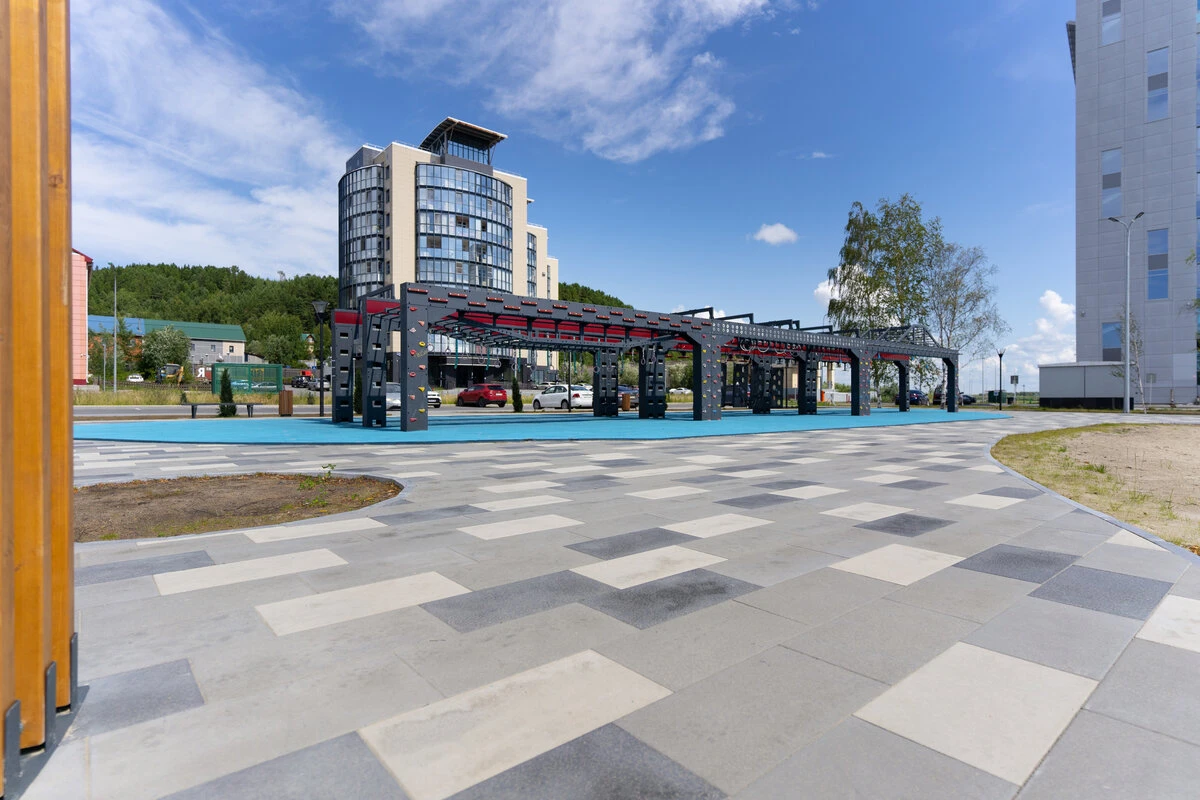 Набережная реки Иртыш в Ханты-Мансийске в районе восточной объездной дороги — еще один проект с нестандартной укладкой тротуарной плитки «Поревит». Основная идея — создать место, где можно активно провести свободное время.