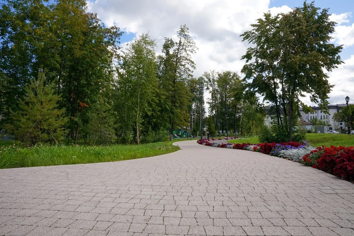 - Ландшафтный дизайн участка с укладкой плитки Старый город и Паркет 180х60 в Тюмени