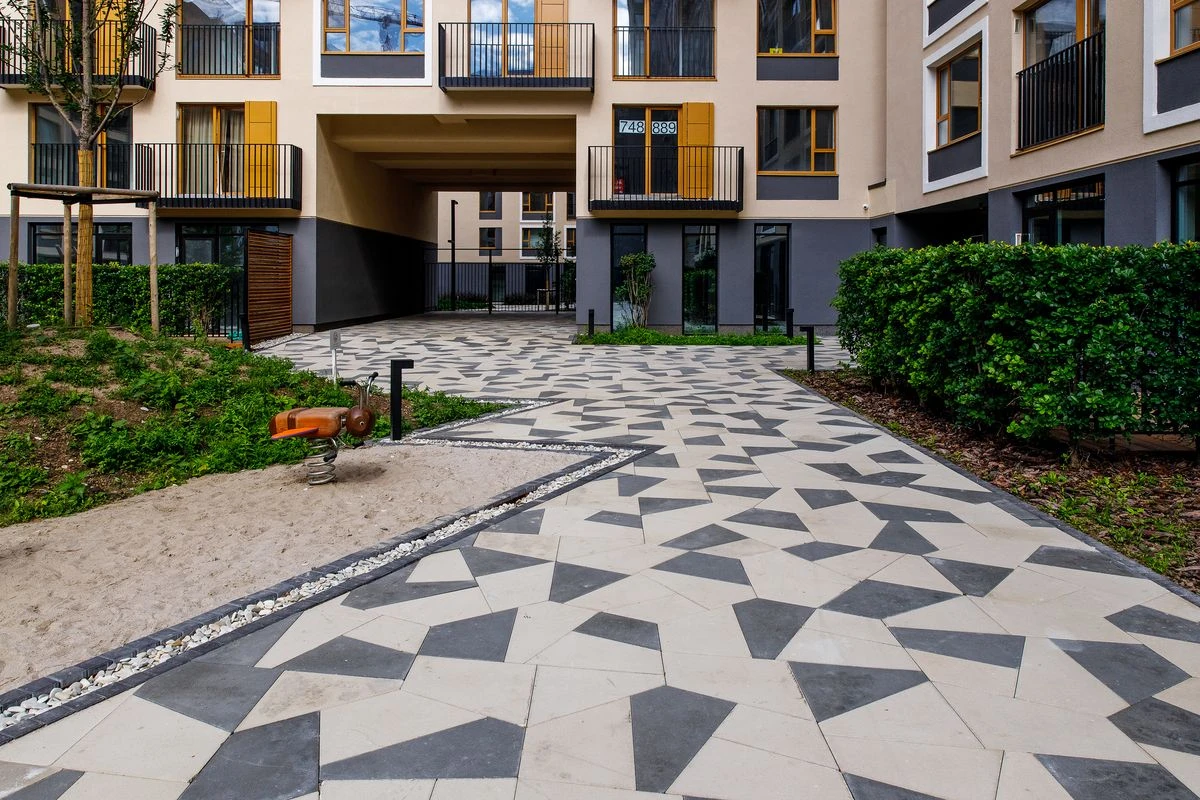 Для благоустройства Жилого комплекса "Октябрьский" использована тротуарная плитка Мозаика, Стандарт, цвет белый и черный.