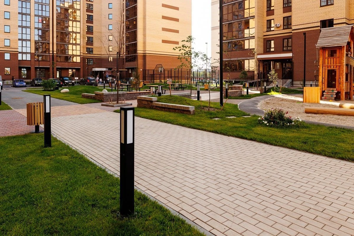 Визуально области не отделяют разные части двора, однако добавляют эффект разнообразия в дополнение к выполненным работам по благоустройству площадки. На проекте используется тротуарная плитка «Поревит» в цветах Белый, Черный, Каир и Клинкер.