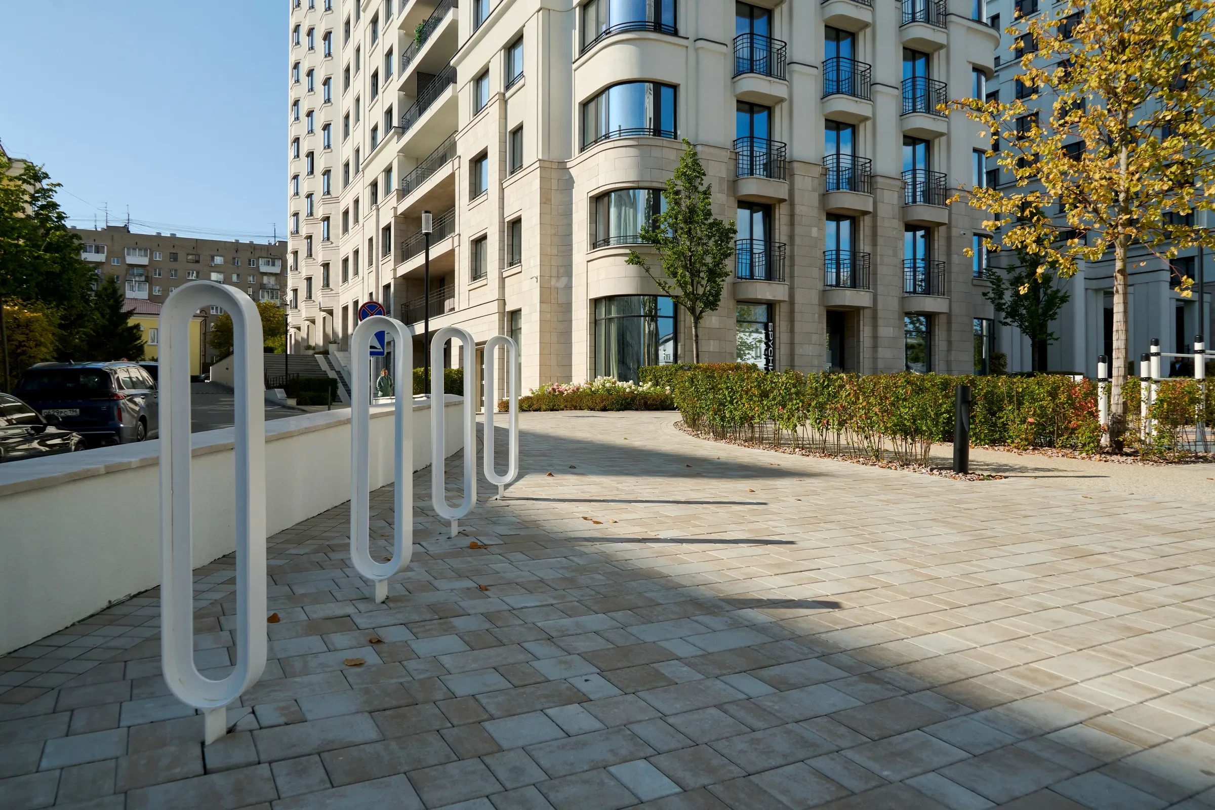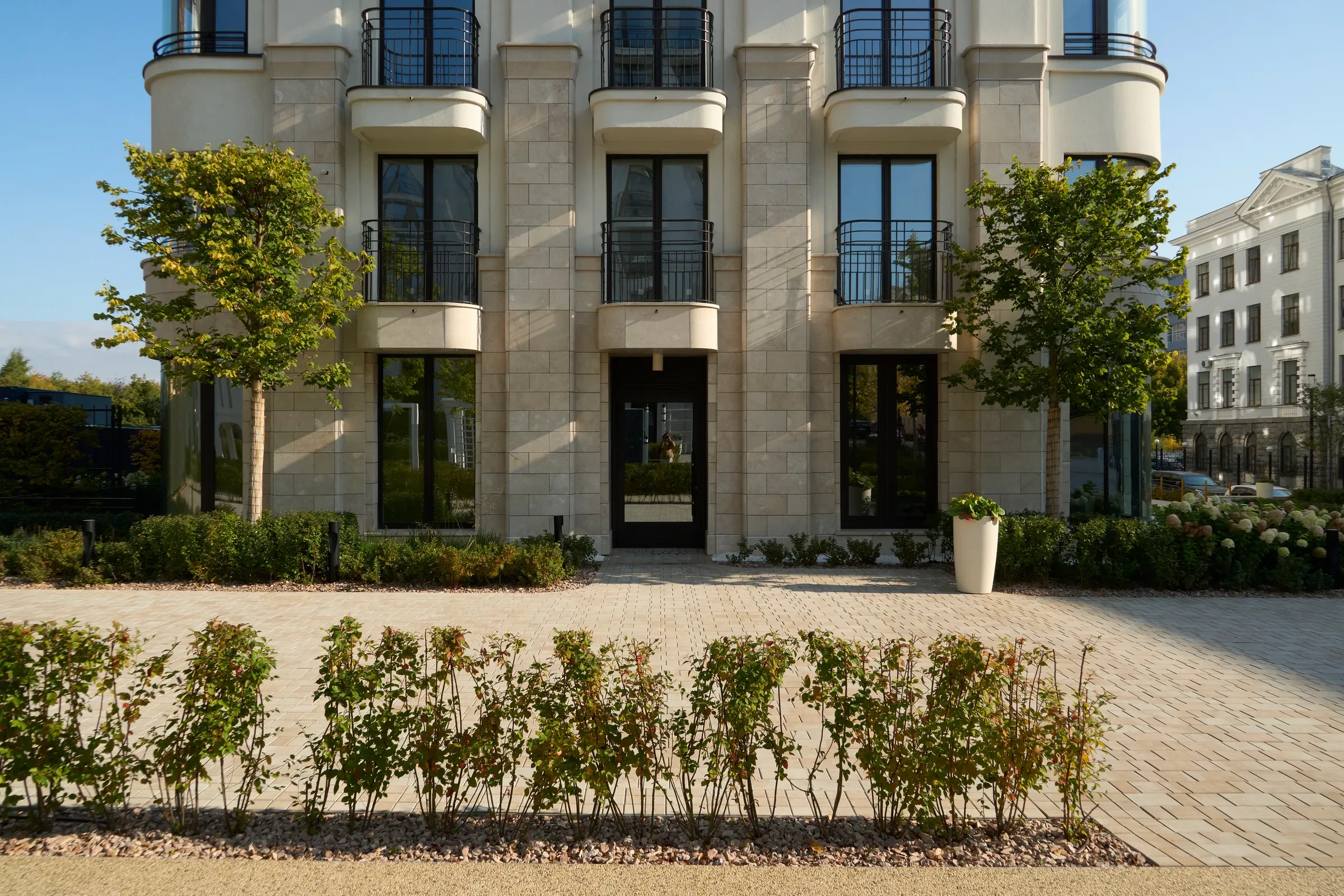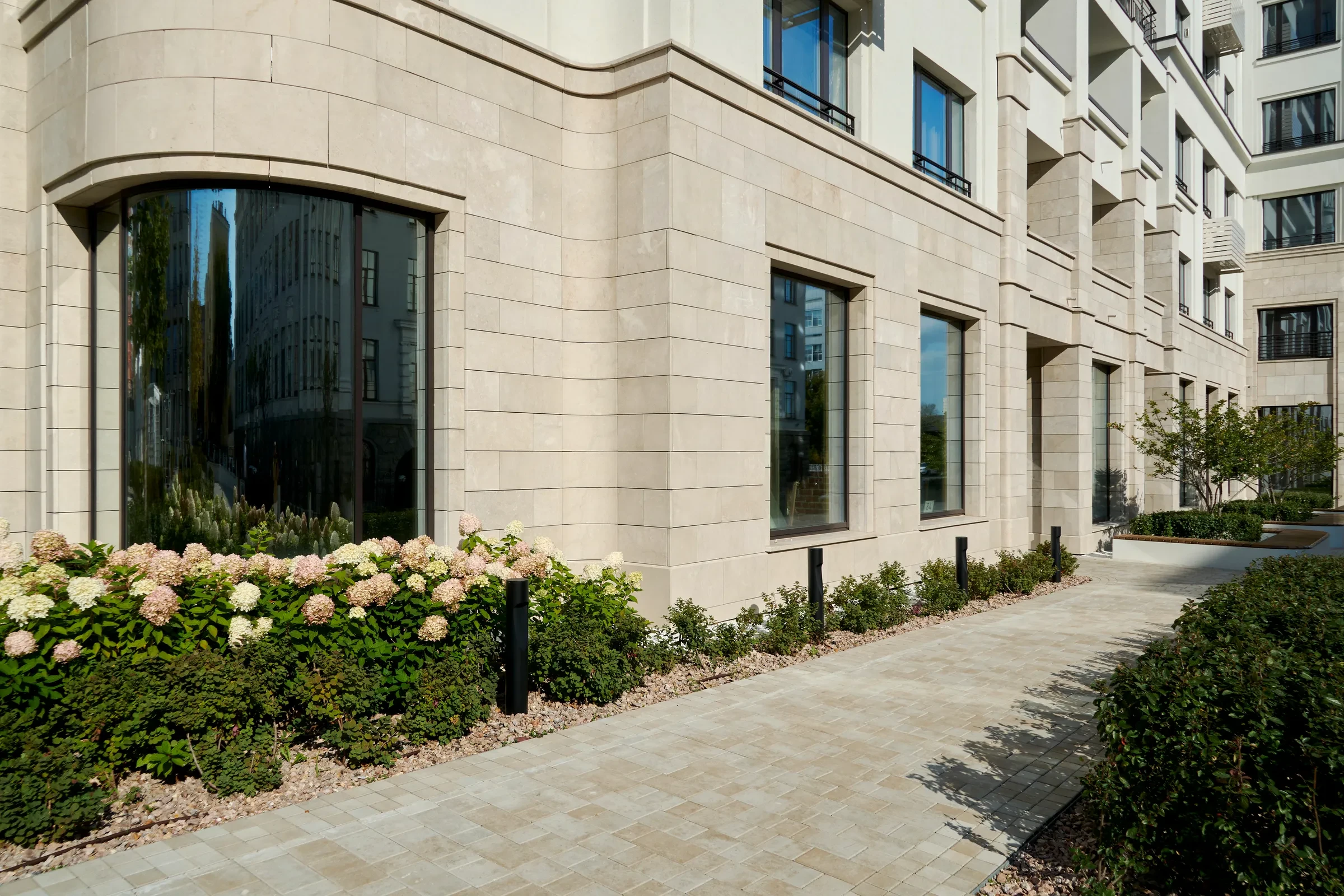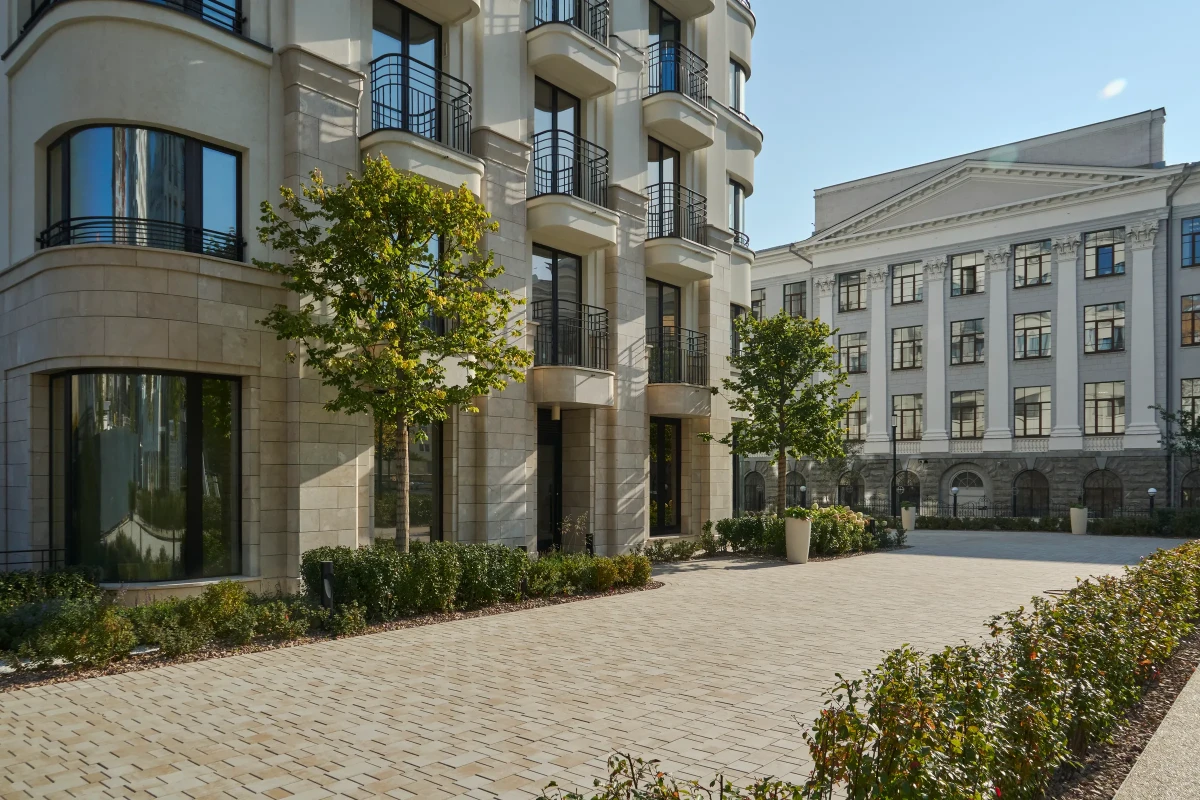 Песчаный цвет плиты идеально сочетается с фасадами домов.