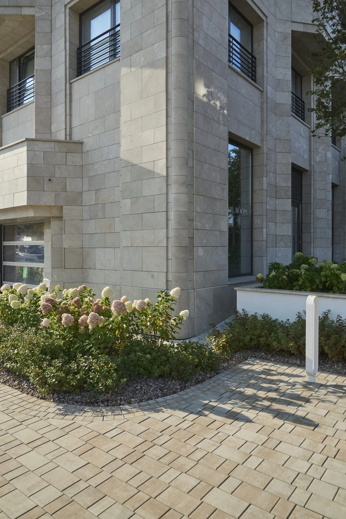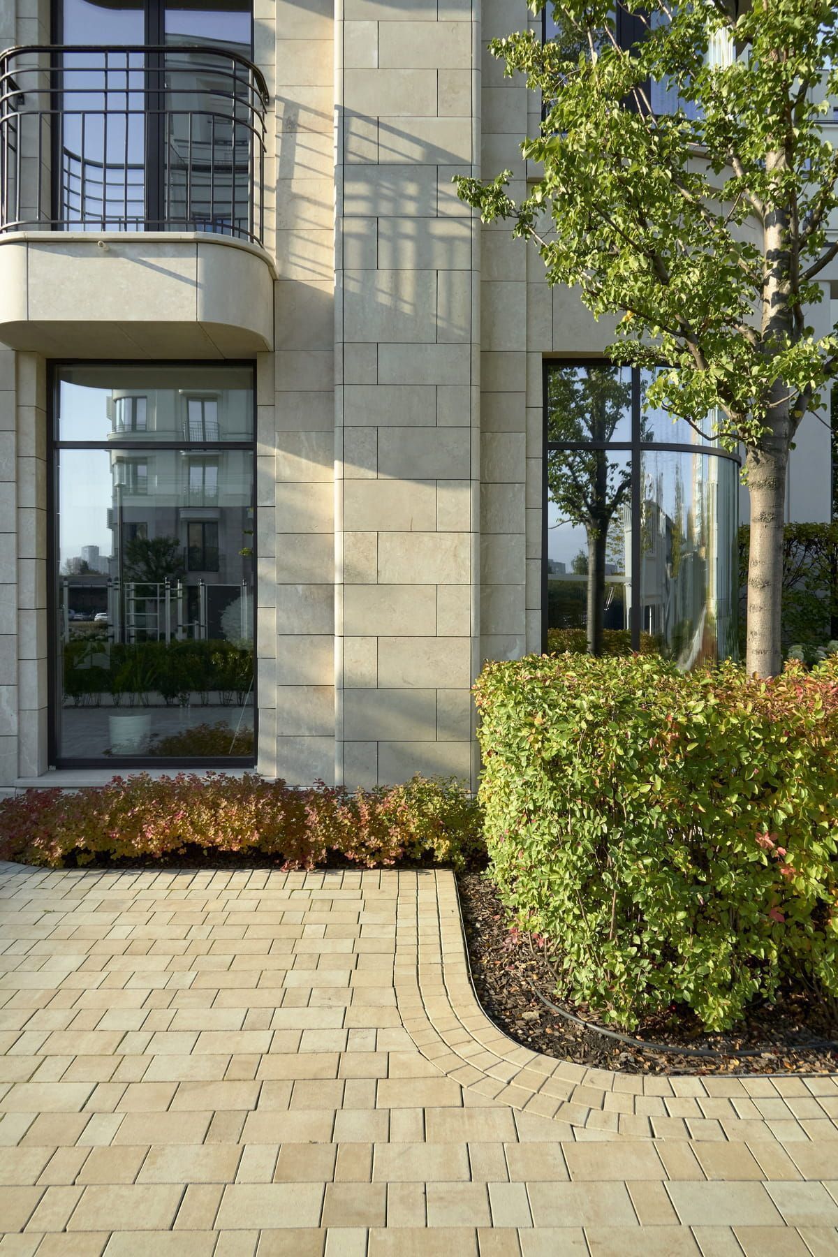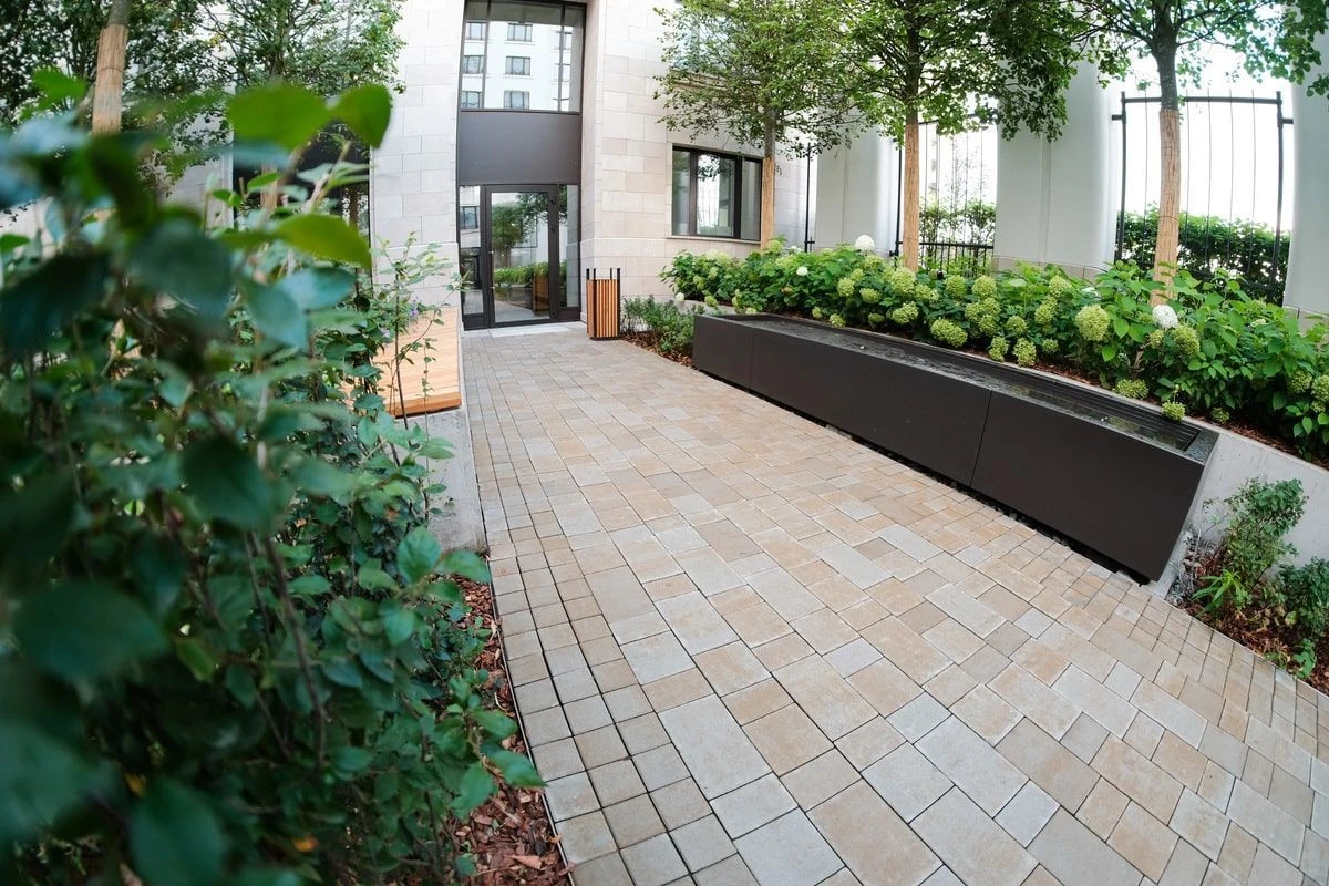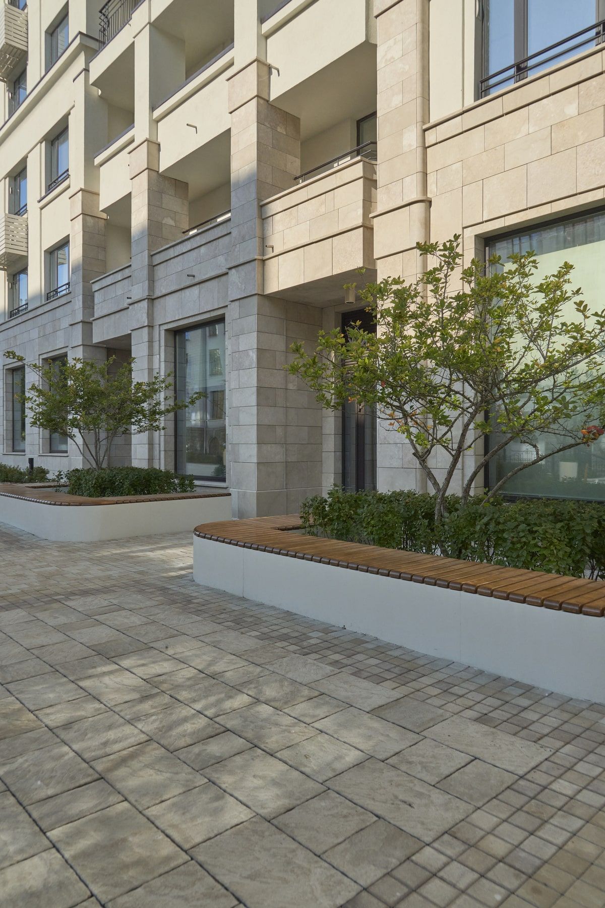 Для благоустройства территории жилого комплекса "На Некрасова" была выбрана плита формы Старый город, в цвете Степняк. А на окантовку Квадрат 100х100 мм. Песчаный цвет идеально сочетается с фасадами домов.
