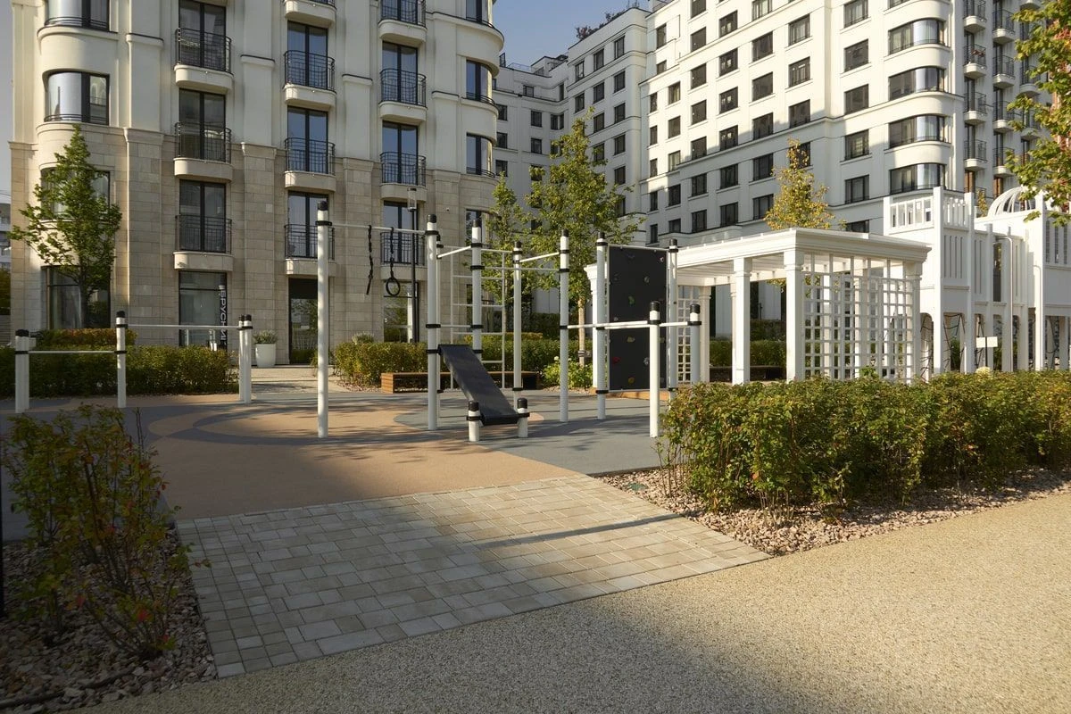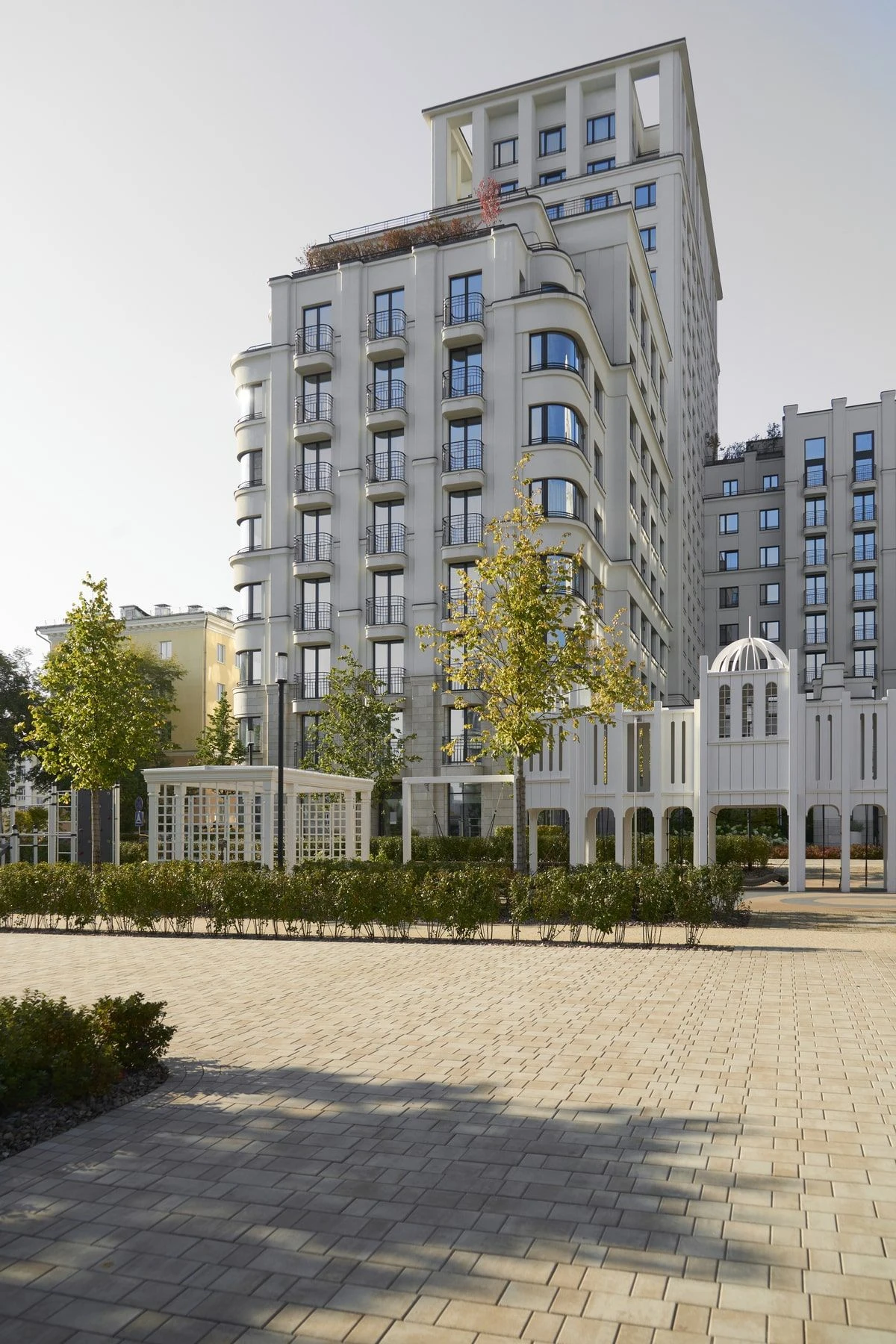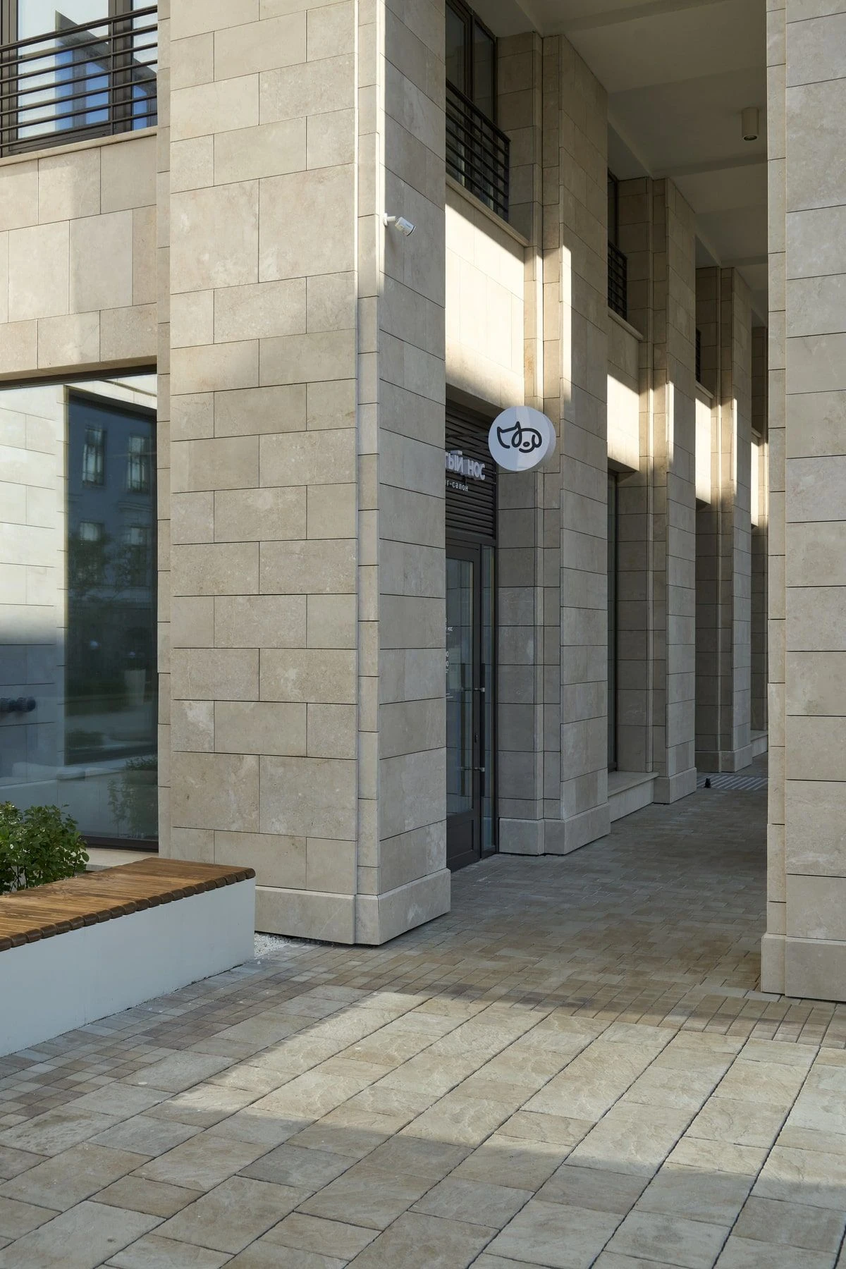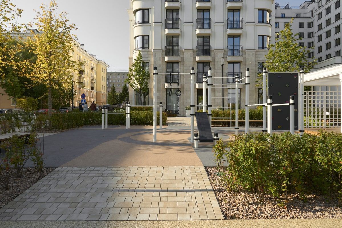Для благоустройства территории жилого комплекса "На Некрасова" была выбрана плита формы Старый город, в цвете Степняк. А на окантовку Квадрат 100х100 мм. Песчаный цвет идеально сочетается с фасадами домов.